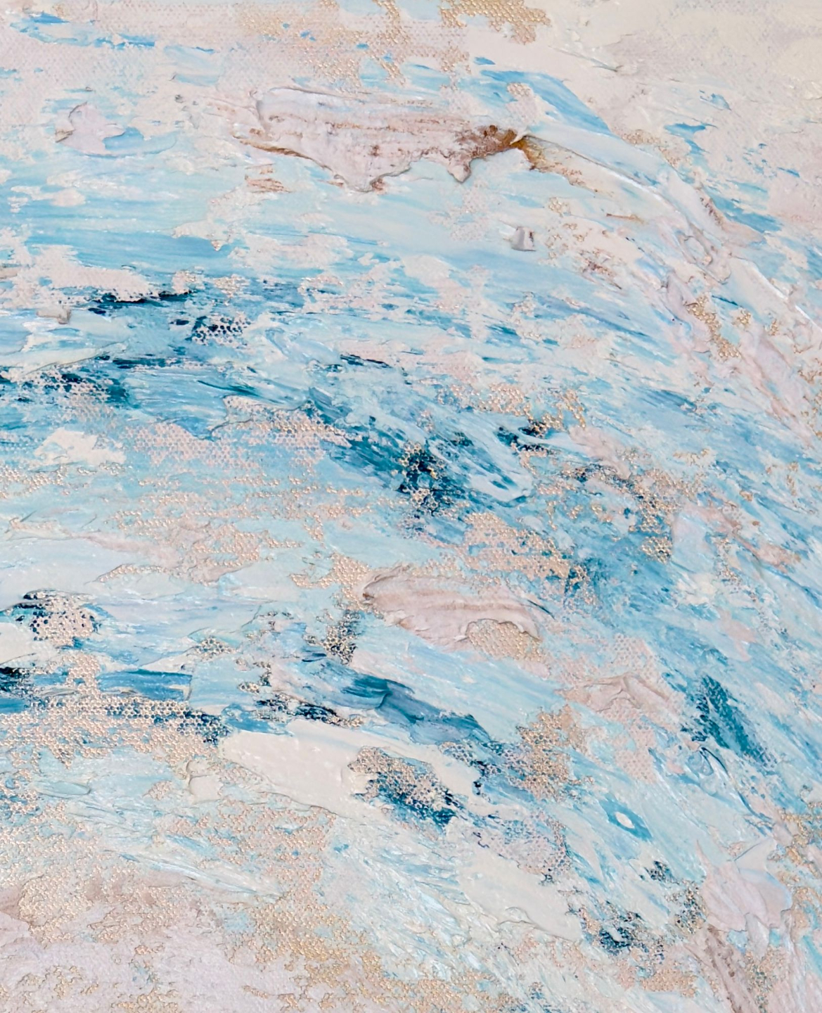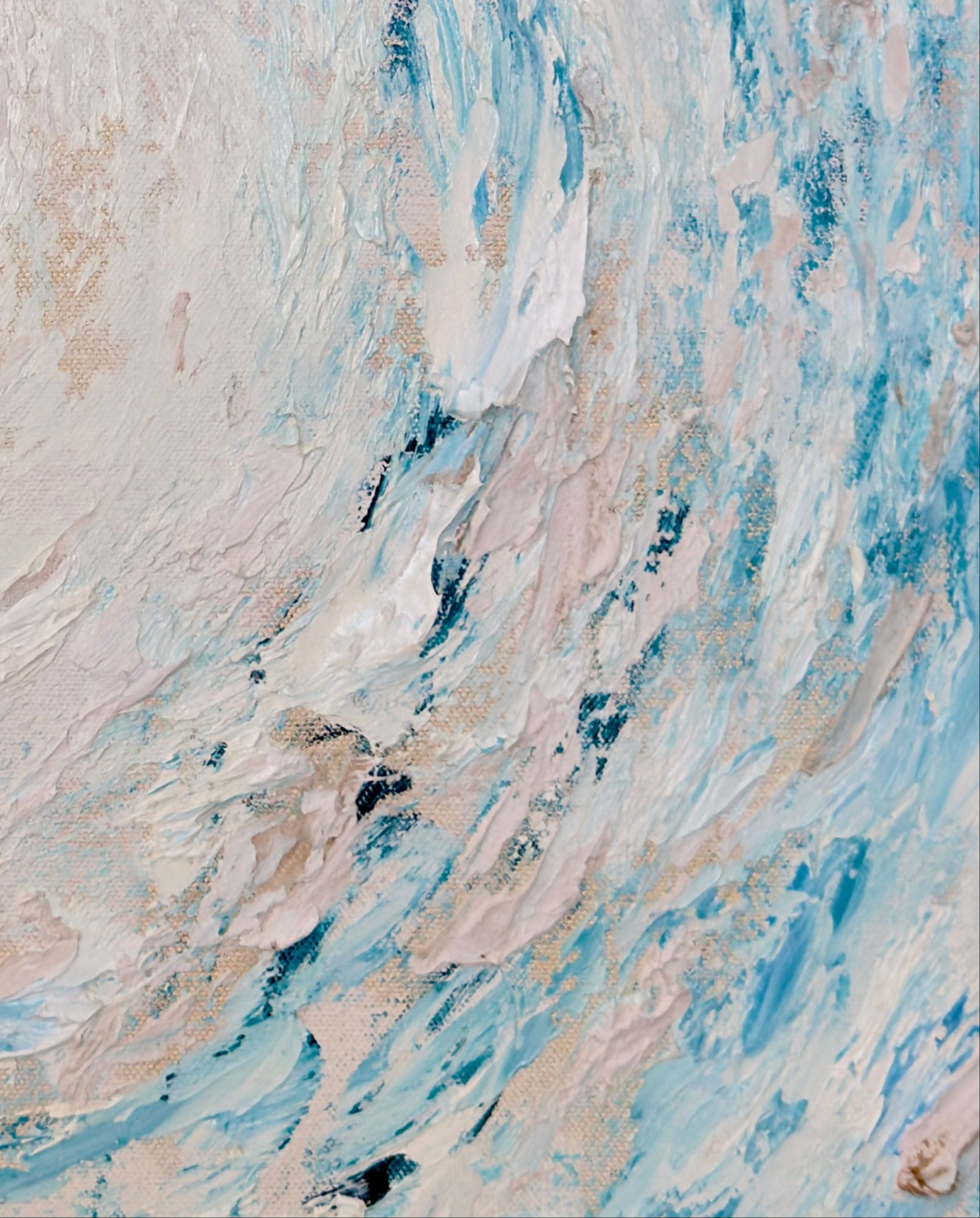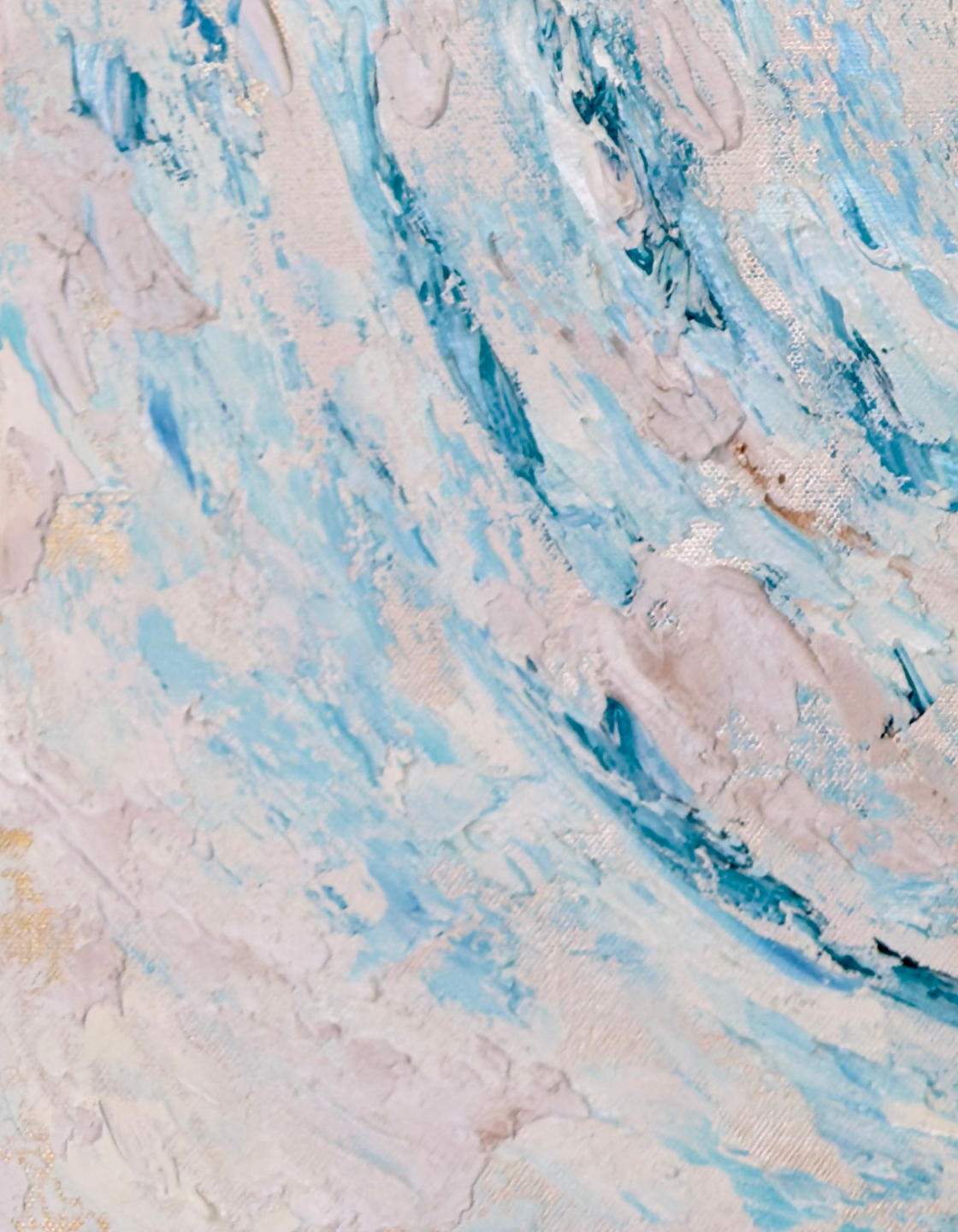 Turquoise tints in soft and electric variations move swiftly in impasto strokes, pulsating as they travel over the canvas. Golden cream impasto weaves in and out, revealing glimpses of subtle pale gold beneath. The overall effect is one of an active ball of energy spinning rhythmically.