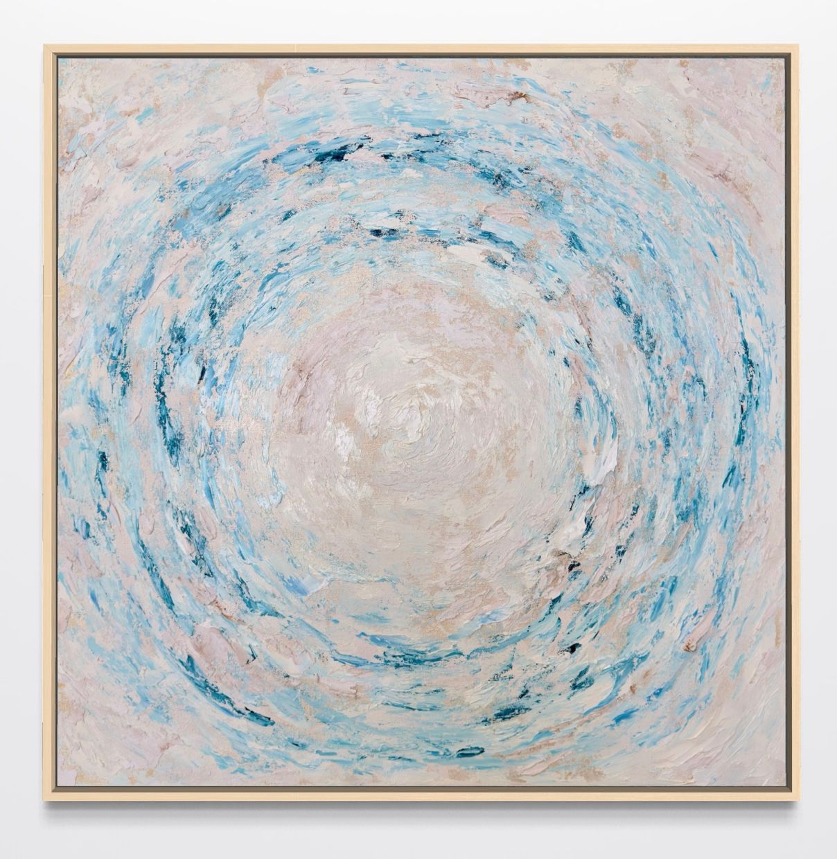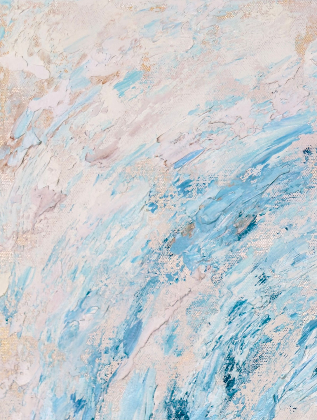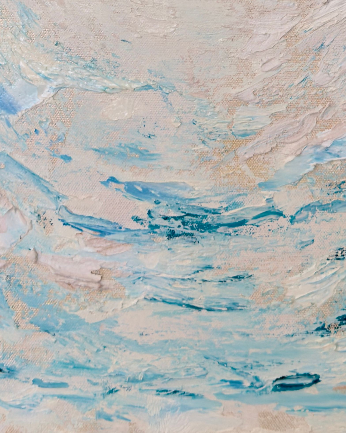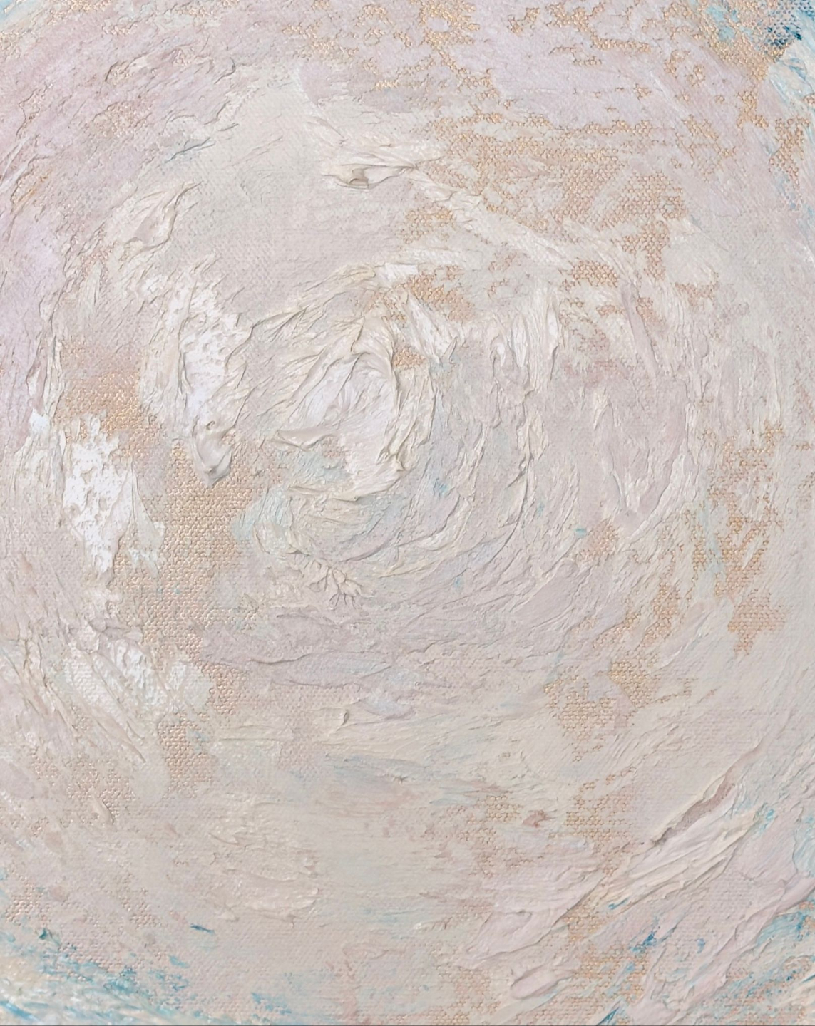 Turquoise tints in soft and electric variations move swiftly in impasto strokes, pulsating as they travel over the canvas. Golden cream impasto weaves in and out, revealing glimpses of subtle pale gold beneath. The overall effect is one of an active ball of energy spinning rhythmically.
